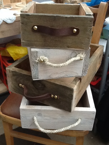 Hubs made me some wooden boxes from some old pallets! Love the rustic look! The green ones are just as they were and the white ones I painted with watered down paint!